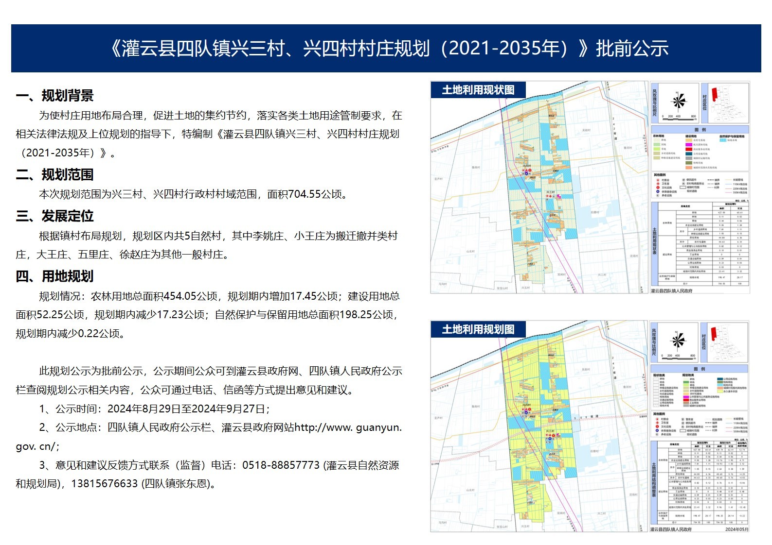 此规划公示为批前公示,公示期间公众可到灌云县政府网、四队镇人民政府公示栏查阅规划公示相关内容,公众可通过电话、信函等方式提出意见和建议。