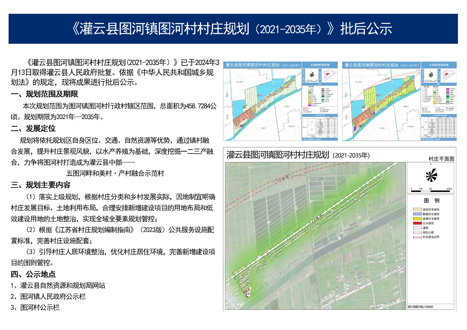 | 标 题 | 图河镇人民政府关于《灌云县图河镇图河村村庄规划(2021-2035年)》的公示 | ||